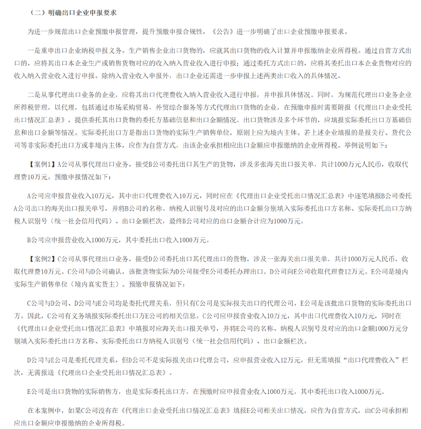 公告第七条明确要求:凡以代理形式出口的企业,必须在预缴申报时同步报送“实际委托出口方”的基础信息及出口金额。 若未如实报送,代理方将被视同自营出口,需就全部出口金额缴纳企业所得税。 该条款所指“代理形式”,包括但不限于以下类模式: 通过外贸综合服务企业“挂名申报,货物由实际卖家出运; 参与“市场采购贸易”试点,以统一报关方式集拼出货; 借用物流商或其他第三方出口资质清关申报。