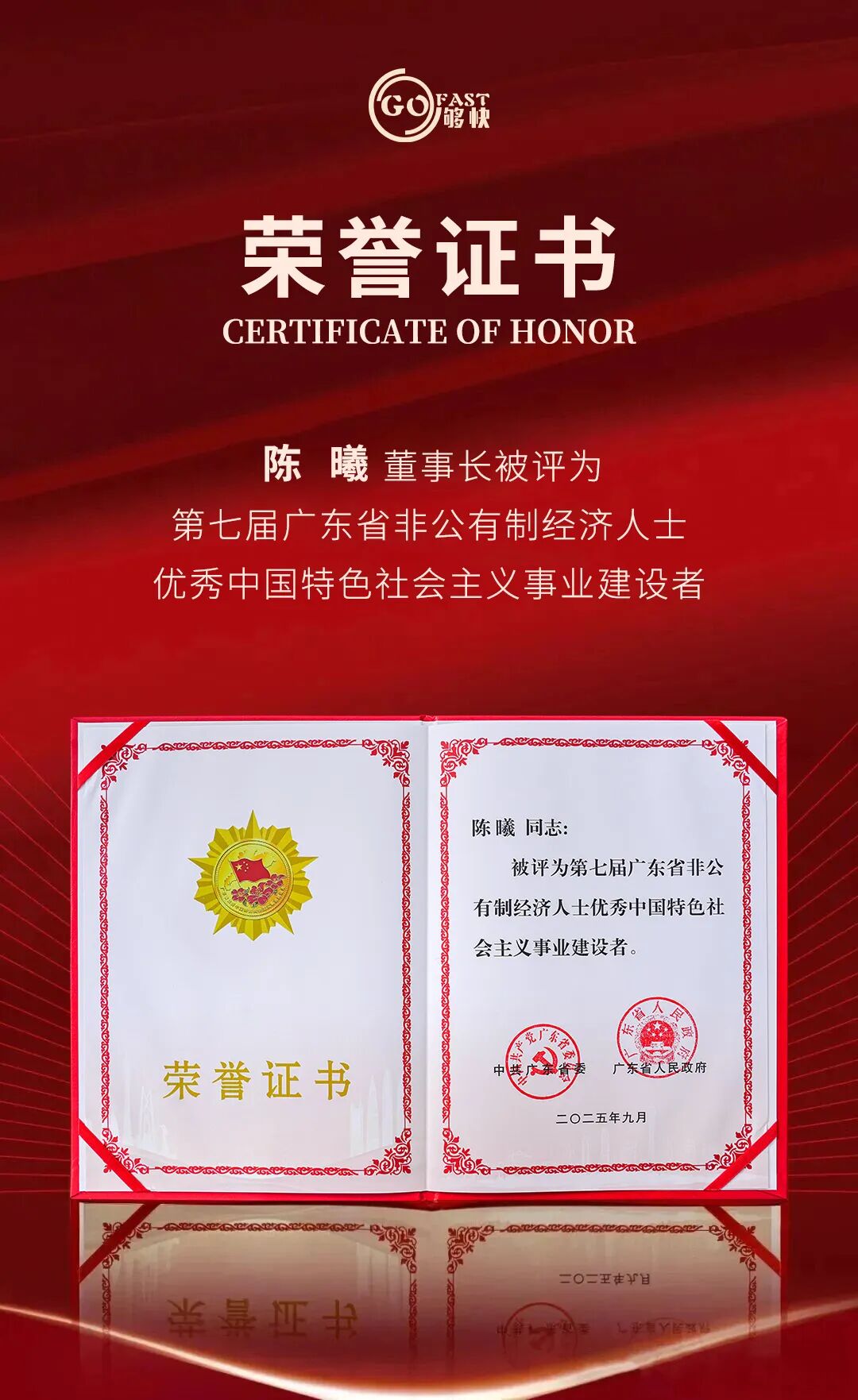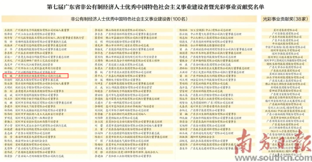 广东够快供应链集团有限公司执行总裁陈曦被授予“广东省非公有制经济人士优秀中国特色社会主义事业建设者”荣誉称号。该荣誉每 3 年评选一次,以 “三强一好” 为严苛标尺,是省内非公有制经济领域的最高褒奖之一。