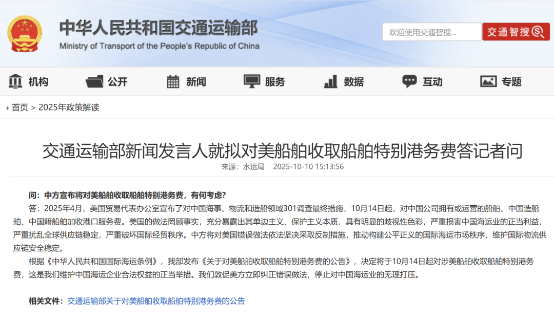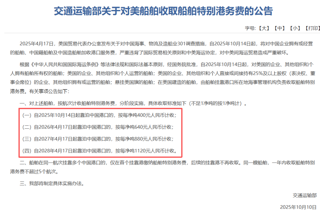 美方港口费细则 根据CBP公告及其附件(CSMS Attachment),收费机制分为三类: 第一类为中国所有或运营的船舶,初始费率为每净吨50美元; 第二类为中国建造的船舶,起征标准为18美元/净吨或120美元/箱,取两者较高者,费率逐年递增; 第三类为汽车运输船或滚装船(Annex III),按每净吨14美元收取费用。 公告明确,缴费责任主体为船舶运营方(vessel operator),并要求其在进港前完成申报与缴费,否则将面临行政处罚。 (美国海关公告截图) 中方反制措施 针对美方在海运领域的歧视性做法,中国交通运输部10日发布公告,决定自2025年10月14日起,对美国船舶征收“船舶特别港务费”,此举被视为针对美国“301调查措施”的正式反制。 公告明确指出,美国自2025年10月14日起将对中国企业的船舶加收港口服务费,严重违反国际贸易原则。中国依照《中华人民共和国国际海运条例》等相关法律,在对等原则下对美方船舶分阶段征收港务费: ①2025年10月14日起:每净吨400元人民币; ②2026年4月17日起:每净吨640元人民币; ③2027年4月17日起:每净吨880元人民币; ④2028年4月17日起:每净吨1120元人民币。 政策适用于美企拥有、运营或持股25%以上的船舶,以及悬挂美国国旗、或在美国建造的船只。 交通运输部新闻发言人就拟对美船舶收取船舶特别港务费答记者问 问:中方宣布将对美船舶收取船舶特别港务费,有何考虑? 答:2025年4月,美国贸易代表办公室宣布了对中国海事、物流和造船领域301调查最终措施,10月14日起,对中国公司拥有或运营的船舶、中国造船舶、中国籍船舶加收港口服务费。 美国的做法罔顾事实,充分暴露出其单边主义、保护主义本质,具有明显的歧视性色彩,严重损害中国海运业的正当利益,严重扰乱全球供应链稳定,严重破坏国际经贸秩序。 中方将对美国错误做法依法坚决采取反制措施,推动构建公平正义的国际海运市场秩序,维护国际物流供应链安全稳定。 根据《中华人民共和国国际海运条例》,我部发布《关于对美船舶收取船舶特别港务费的公告》,决定将于10月14日起对涉美船舶收取船舶特别港务费,这是我们维护中国海运企业合法权益的正当举措。我们敦促美方立即纠正错误做法,停止对中国海运业的无理打压。 文章转自网络,如有侵权,请告知删~