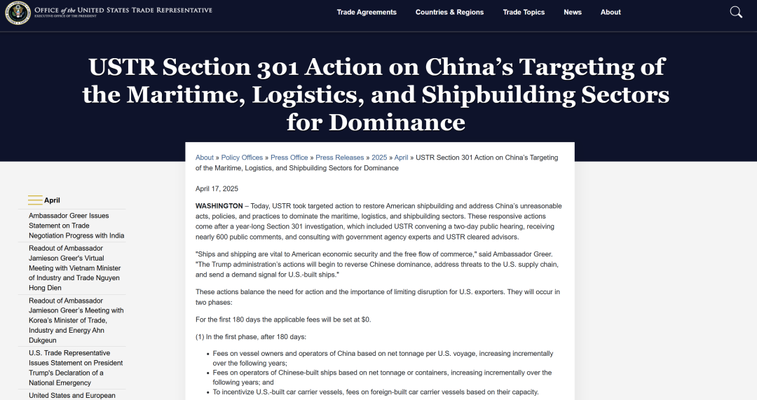 近日,美国海关与边境保护局(CBP)正式发布《第301条款船舶费用》(Section 301 Vessel Fees)公告,宣布自10月14日起,对中国拥有、运营或建造的船舶,以及外国建造的汽车运输船,在进入美国港口时征收新的港口服务费。
